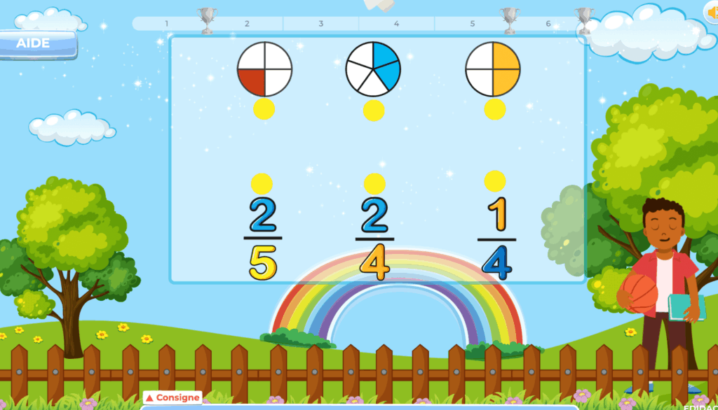 En CM2, les fractions deviennent un outil de calcul essentiel pour préparer l'entrée en 6ème. Edidact regroupe tout le programme de mathématiques du CM2 en exercices interactifs et en fiches PDF à imprimer. Que ce soit pour automatiser les calculs, apprendre à décomposer ou lier fractions et décimaux, accédez immédiatement à des ressources conformes aux attentes de l'Éducation Nationale.